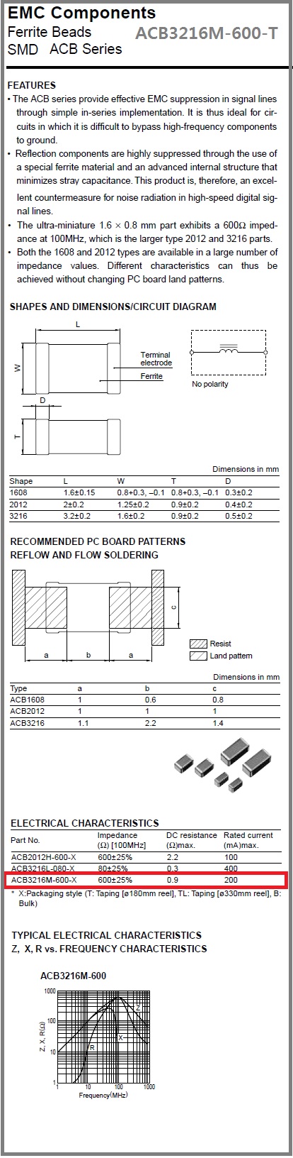 • 초소형 1.6´ 0.8mm 부품은 600W 임피던스를 나타냅니다.