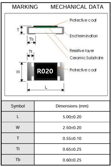 Part No: WW20XR020JTL. 0.02ohm-J. 0.5W(1/2W)